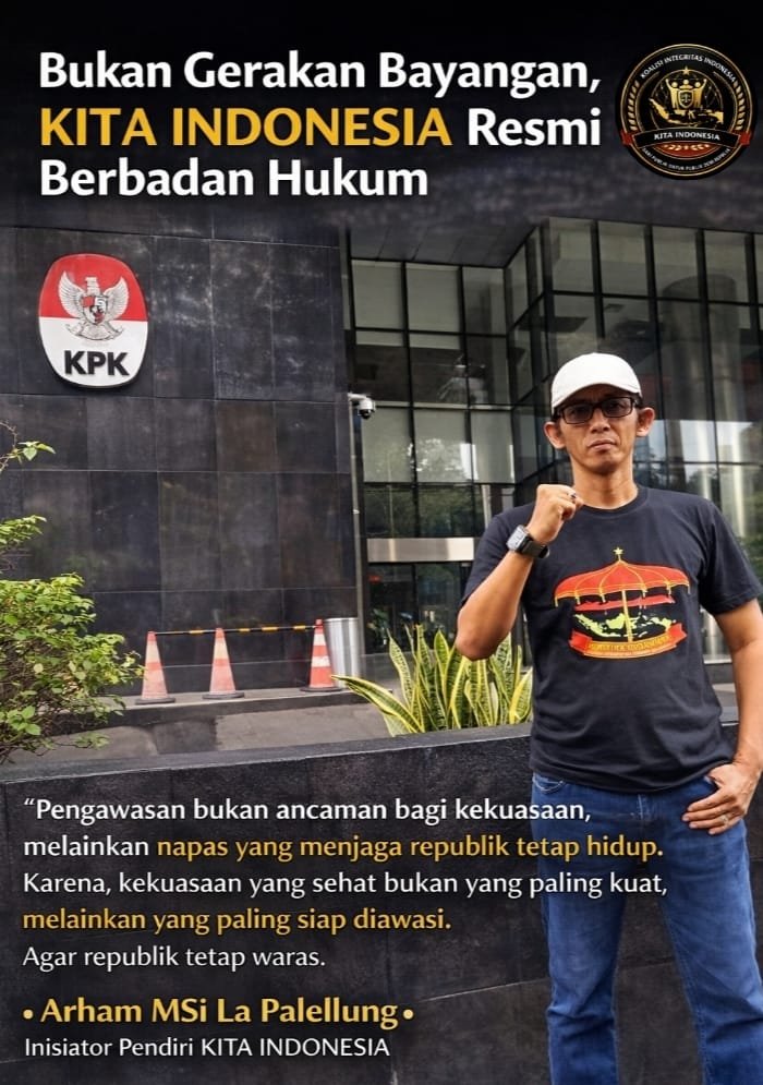 Inisiator pendirian KITA INDONESIA, Arham MSi La Palellung, menegaskan bahwa kehadiran organisasi ini bukan untuk menjadi oposisi politik, melainkan sebagai instrumen pengawasan publik yang independen, sah secara hukum, dan berpihak pada kepentingan warga negara.